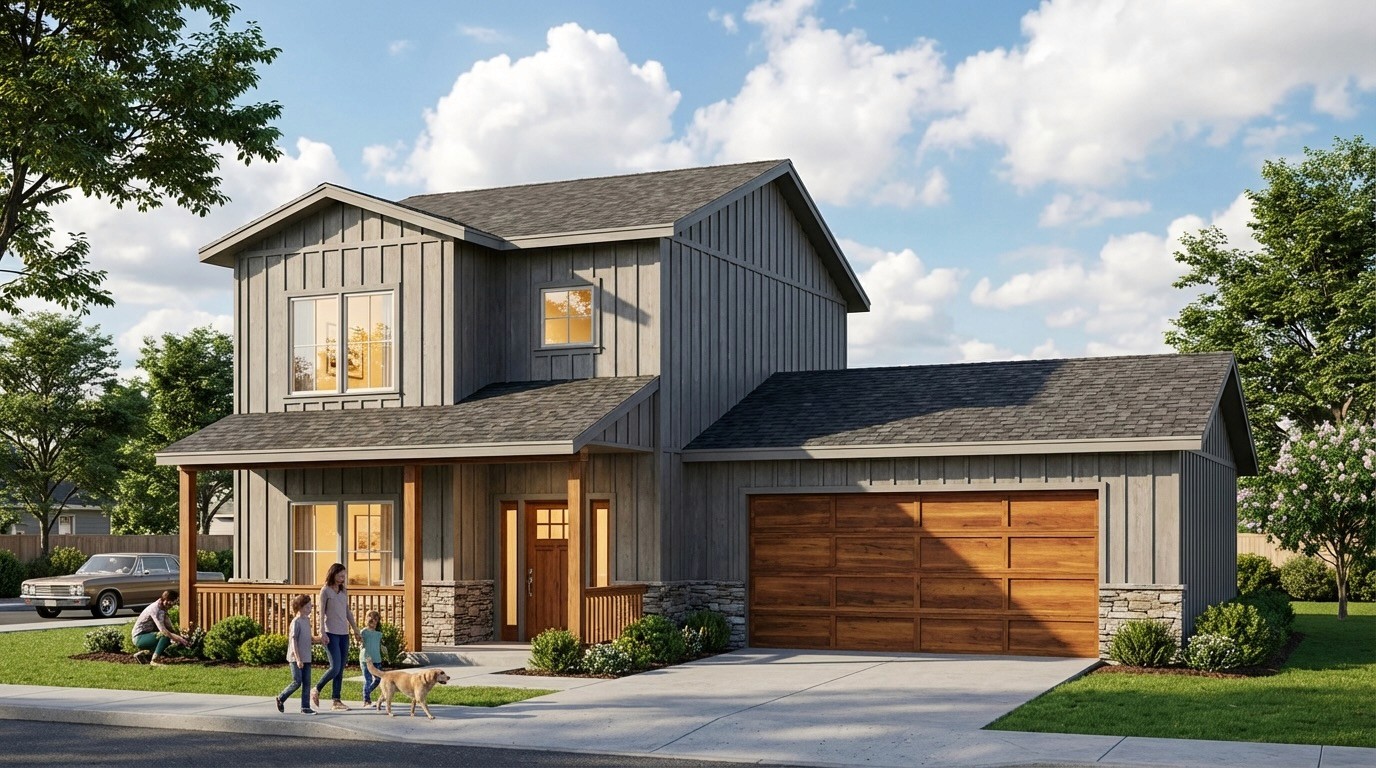 Birchwood is a bold two-story design that makes an immediate impression. Dark charcoal siding, rich wood-look garage doors, and stone accents at the base come together in a modern farmhouse aesthetic that feels both refined and grounded. With two thoughtfully arranged units under one roofline, it's a rare opportunity to live in a premium new-construction home while benefiting from the flexibility a duplex provides.