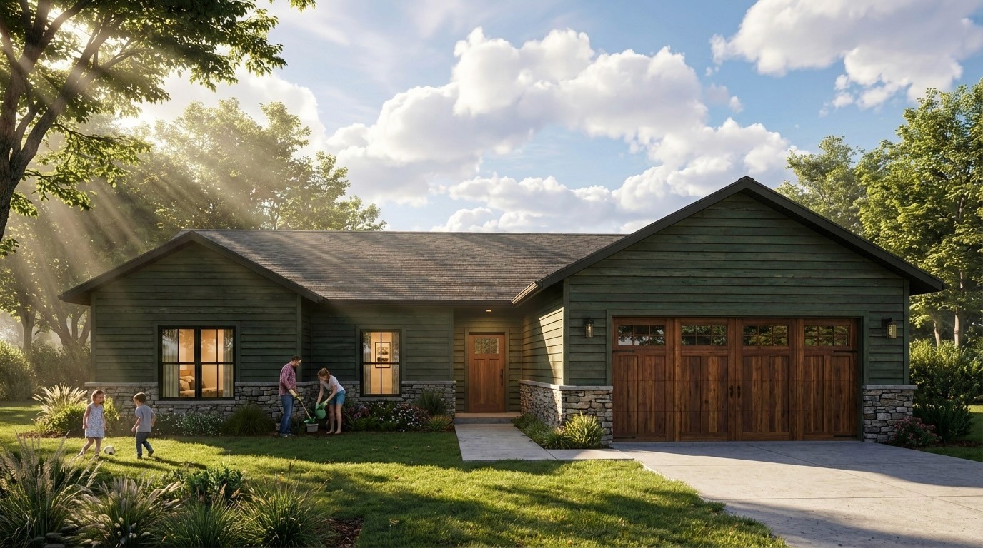 Prairie is the home for those who want something grounded, earthy, and undeniably livable. Dressed in sage green lap siding with a stone-accented base and warm wood garage door, this single-story ranch sits naturally in its surroundings like it was always meant to be there. The low, wide roofline and generous window placement give the home an open, relaxed feel — the kind of place where kids play in the yard, gardens get planted, and life happens at an unhurried pace.