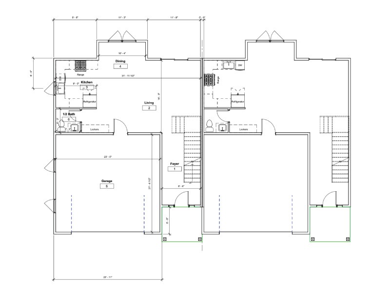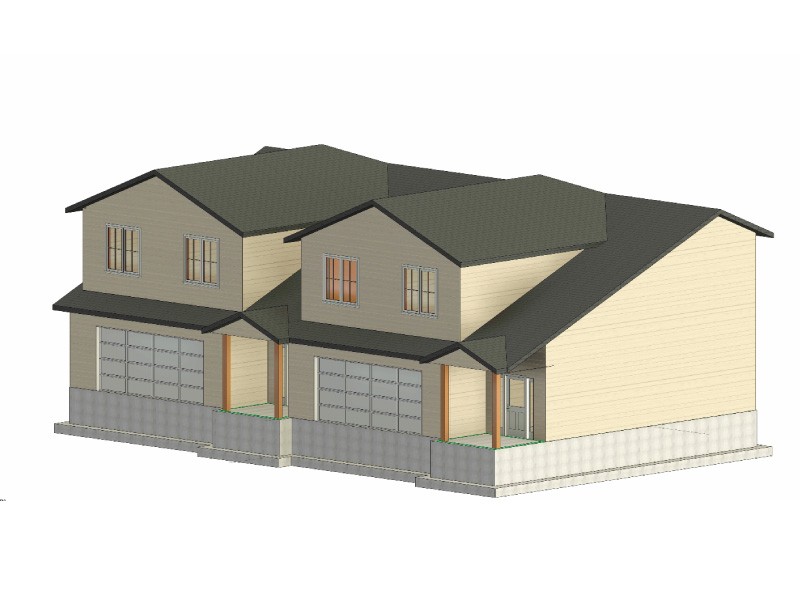 Birchwood is the standout of the Walnut Acres development - a striking two-story duplex that commands attention from the street. The exterior blends dark charcoal horizontal siding with vertical board-and-batten accents, rich wood-look garage doors, and stacked stone detailing at the base to create a layered, contemporary farmhouse look. It's a home that looks like it belongs on a design magazine cover, while still feeling approachable and livable. The warm glow of interior lighting through large, well-placed windows adds an inviting quality that's hard to ignore.